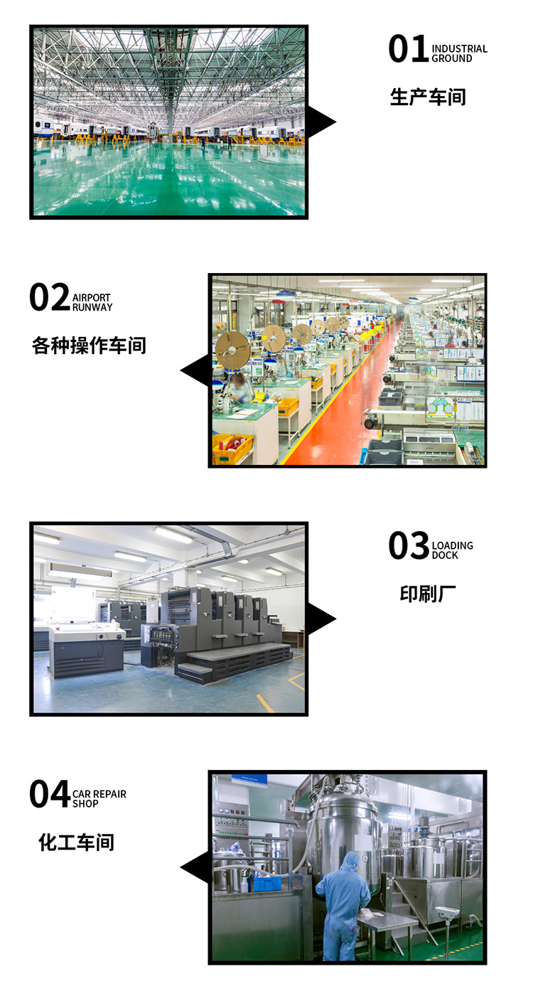電器、電子、機(jī)械、食品、醫(yī)藥、化工、煙草、飲料、紡織、服裝、家具、塑料、文體用品等制造工廠的車(chē)間水泥或水磨石地面。
